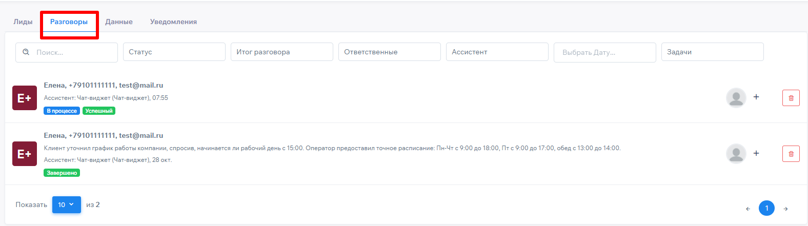 Диалоги передаются из подключенных к eVa каналов связи. Они расположены в виде блоков. Каждый разговор содержит имя, телефон и почту клиента, итог разговора (если он завершён), наименование AI-ассистента, дату разговора и статус разговора (см. ниже).