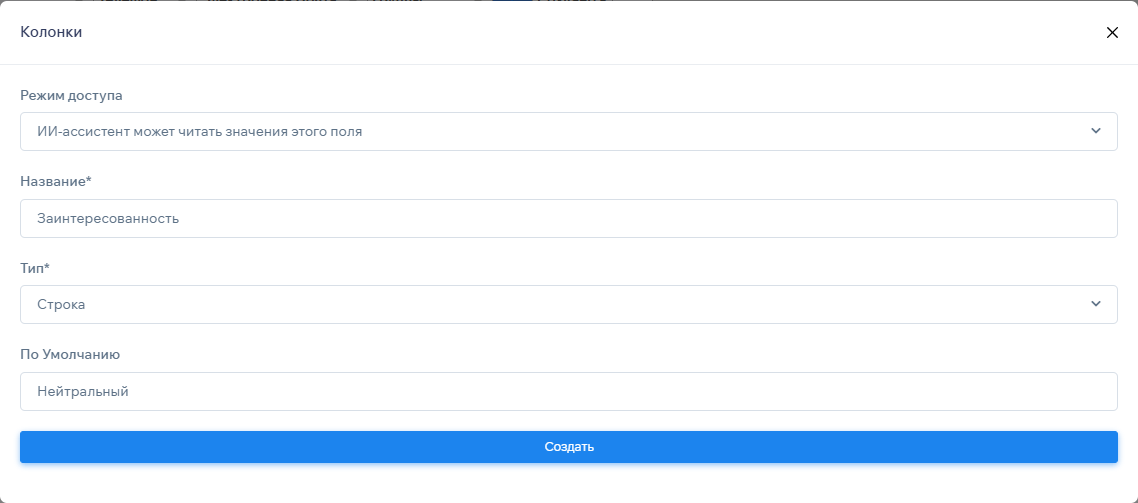 - Режим доступа. Укажите, может ли ИИ-ассистент только читать содержимое колонки, либо и читать, и менять его, либо закройте доступ ИИ к этим данным, если они предназначены только для внутреннего использования.