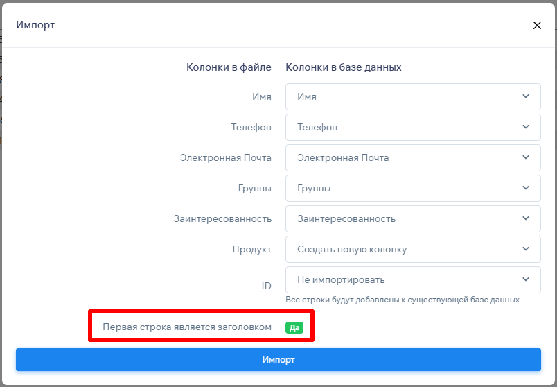При наличии совпадений в колонках "Телефон", "Электронная почта" и "ID" с существующими в системе записями соответствующие строки будут обновлены данными из файла.