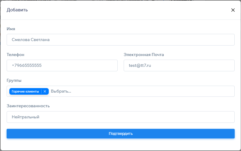 над таблицей. Откроется окно добавления лида с полями для заполнения, соответствующими существующим в таблице колонкам.
