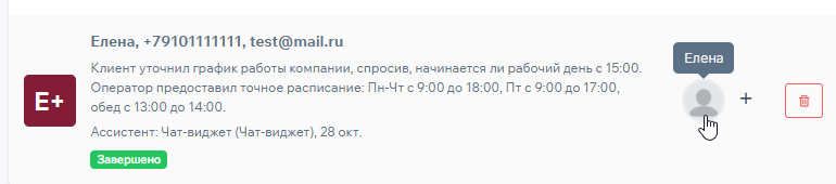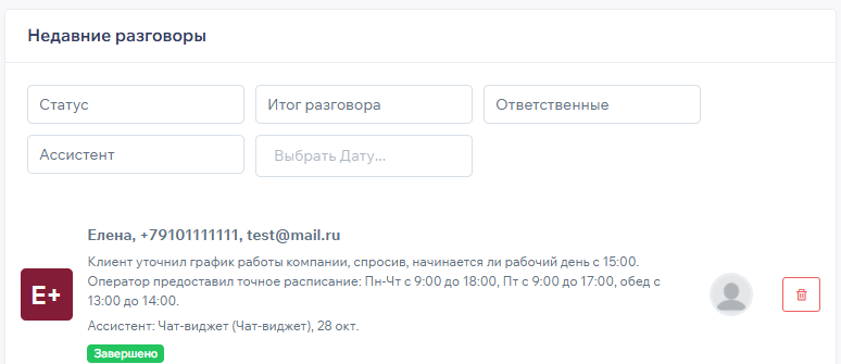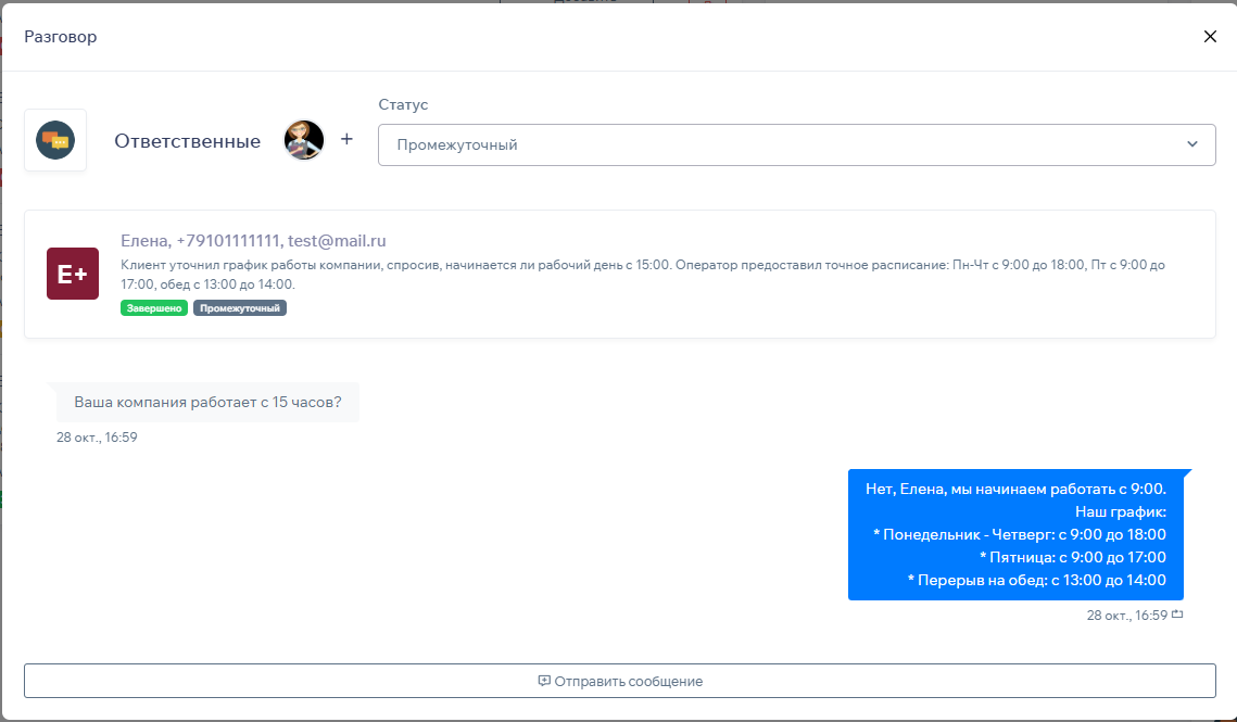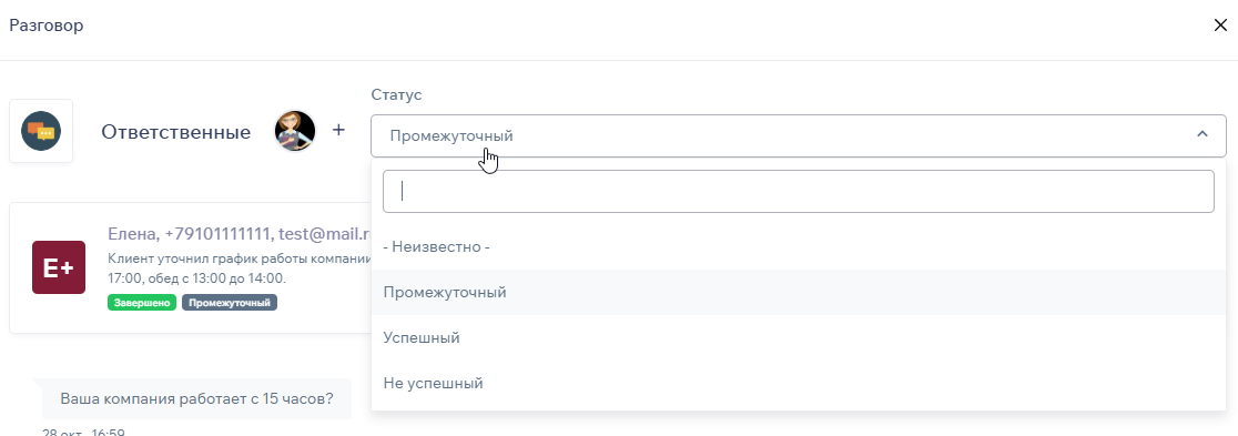 В верхней части окна можно добавить ответственного и изменить/добавить статус итога разговора.