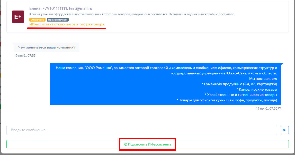 Чтобы добавить ещё одно сообщение, нажмите "Отправить сообщение". Сразу по нажатию этой кнопки ИИ отключится от диалога, и разговор перейдёт в ручной режим. Чтобы вручную вернуть ИИ в диалог, нужно будет нажать "Подключить ИИ-ассистента" внизу окна: