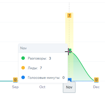 Вертикальная ось графика обозначает количество, горизонтальная - месяцы. Под горизонтальной осью расположена легенда с обозначением цветов графика для разговоров, лидов и голосовых минут.
