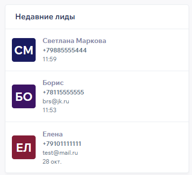Блок "Недавние лиды" расположен под графиком статистики справа от недавних разговоров. Он содержит список последних добавленных лидов с их номером телефона, email-адресом и датой добавления. Если лид добавлен сегодня, то вместо даты будет время добавления.