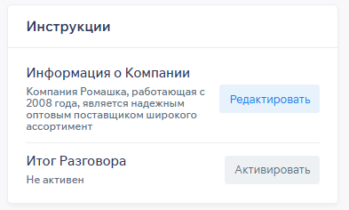 В блоке "Инструкции" в правой части панели управления вы можете добавить, изменить или отредактировать инструкции для AI-ассистентов, на основе которых будут строиться ответы клиентам.