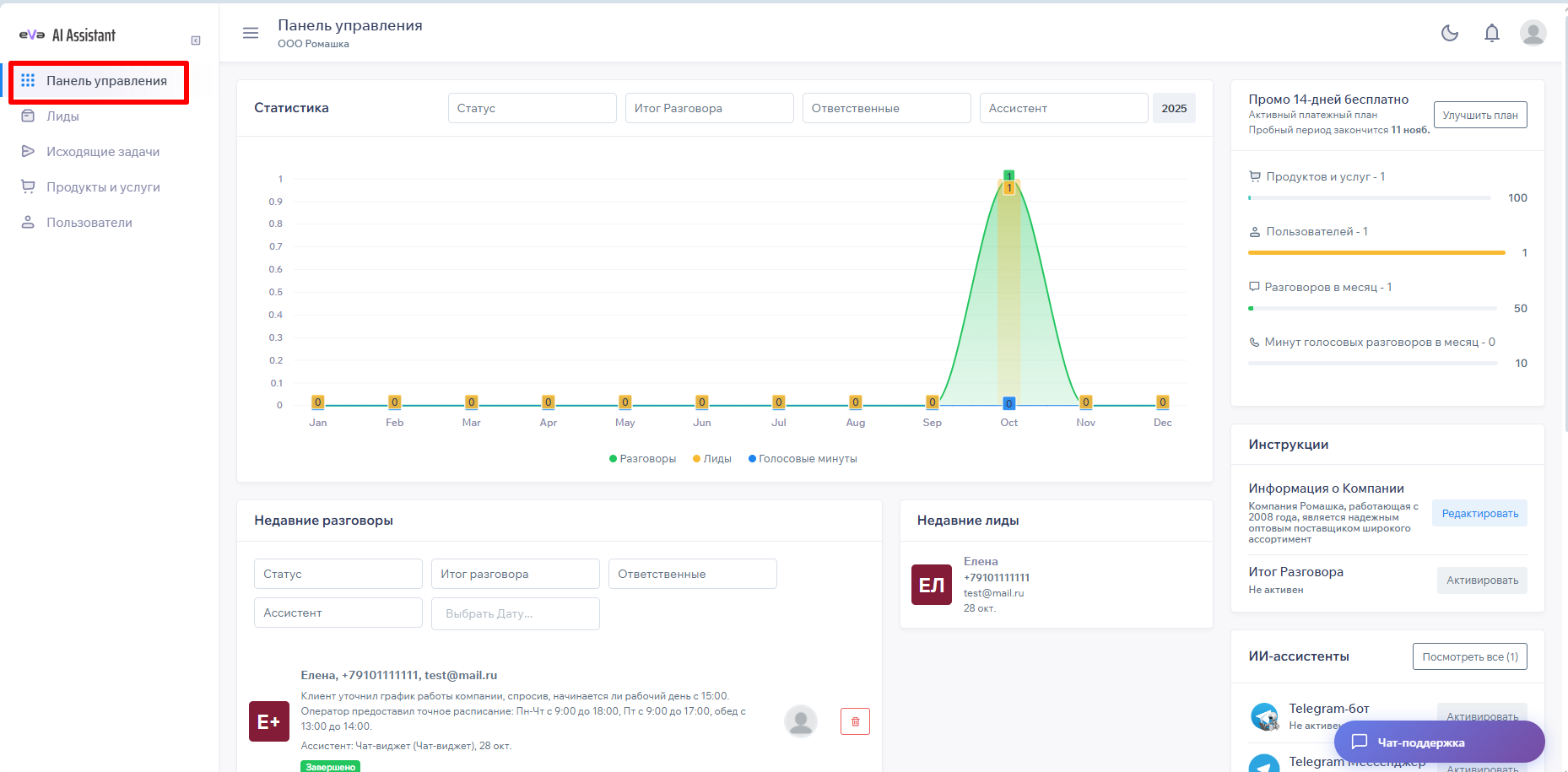 Панель управления - основная информационная панель, расположенная в боковом меню. В ней собрана статистика взаимодействий с клиентами, информация о текущем тарифном плане с возможностью его изменить, инструкции для ИИ, а также информация о недавних разговорах и недавно добавленных лидах.