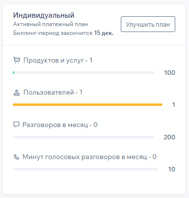 вы перейдёте в раздел Биллинг, где можно изучить другие платёжные планы, изменить существующий план либо докупить к нему разговоры или голосовые минуты.