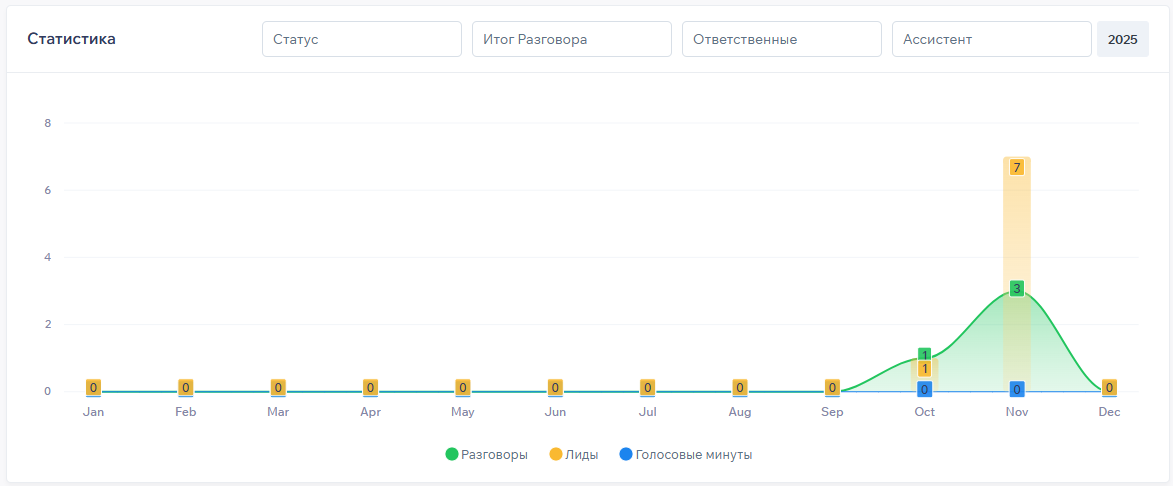 В верхней части страницы расположен график "Статистика". Он показывает количественное распределение разговоров, лидов и голосовых минут по месяцам текущего года.