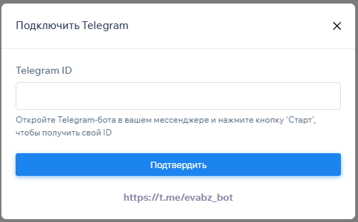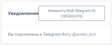 В правой нижней части Панели управления находится блок "Уведомления", в котором можно подключить телеграм-бота к вашему телеграм-аккаунту для оперативного отслеживания событий и разговоров с клиентами. Кроме того, подключение бота активирует двухфакторную аутентификацию в сервисе eVa. После подключения вы сможете заходить в сервис только после ввода кода подтверждения, отправленного вам через бота.