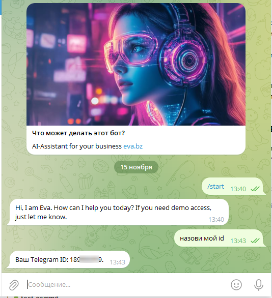Перейдите по ссылке https://t.me/evabz_bot, нажав на неё, либо найдите в поиске в телеграме бота @evabz_bot и нажмите кнопку "Старт". Запросите ваш ID.