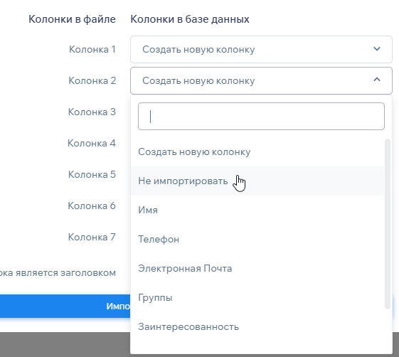 Если колонки с таким названием нет, система предложит создать новую колонку. Отдельные колонки можно не импортировать, выбрав в раскрывающемся списке соответствующий вариант.