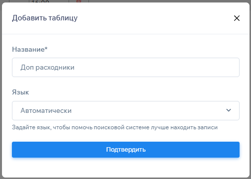 В открывшемся окне введите название таблицы и задайте язык, чтобы помочь поисковой системе лучше находить записи.