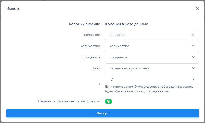 Импорт с заголовками колонок удобен, если заголовки полностью или частично соответствуют названиям колонок в системе eVa.
