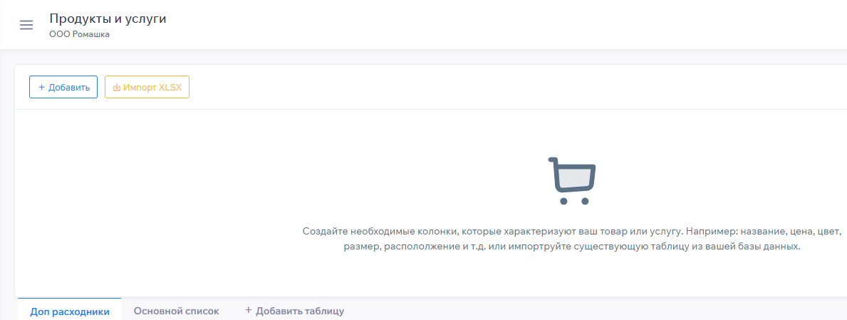 Для ручного добавления продуктов и услуг необходимо прежде всего создать колонки таблицы. Если колонок ещё нет, нажмите