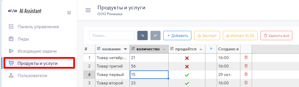 В разделе "Продукты и услуги" вы можете добавлять и редактировать список ваших продуктов и услуг. На основе этого списка искусственный интеллект сможет давать клиентам ответы на вопросы по вашему ассортименту.