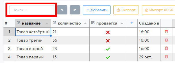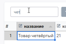 Поиск работает по всем данным всех колонок по любой части слова или номера. Начните вводить название или данные любой колонки, чтобы быстро найти нужные строки: