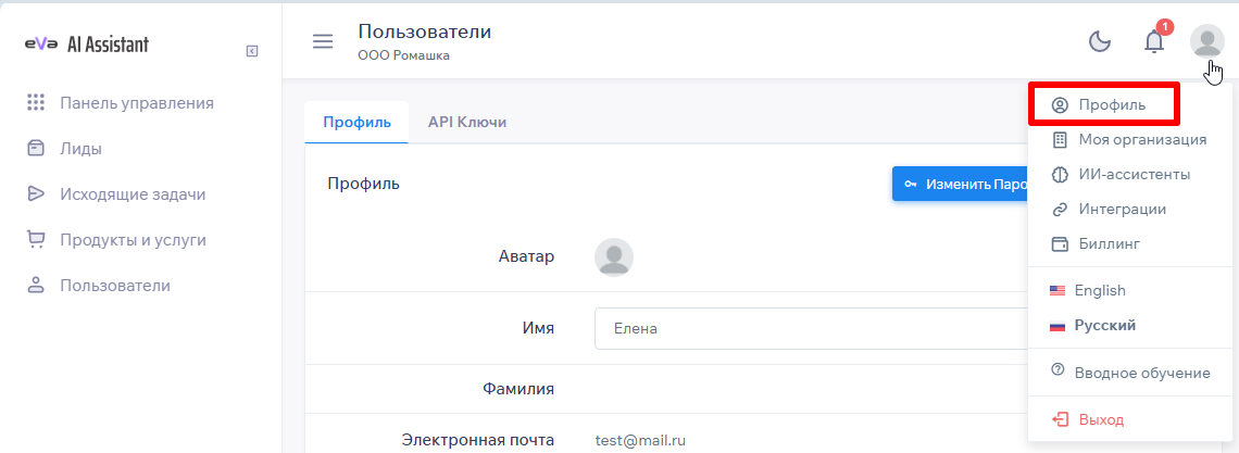 - Электронная почта - нажмите на неё, чтобы её изменить. Она же является логином при входе в систему.