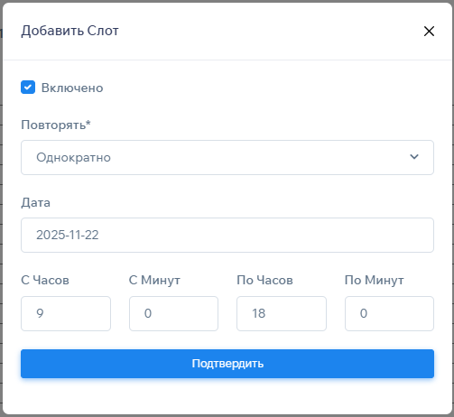 Флажок "Включить" позволит активировать или отключить слот. Опция "Повторять" позволит настроить постоянное расписание внутри слота. Доступны следующие варианты: * Однократно. * Каждый выбранный день недели. * С понедельника по пятницу. * Суббота и воскресенье.