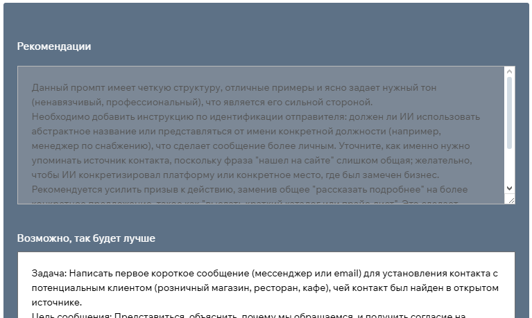 Кнопка "Проверить инструкции" запускает анализ текста задачи искусственным интеллектом. По его завершению выдаётся рекомендация и исправленный текст.