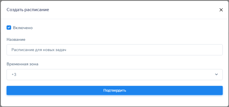 В открывшемся окне введите заголовок расписания (по этому заголовку вы будете его выбирать в списке для привязки к задаче). Выберите временную зону - они обозначены в UTC.