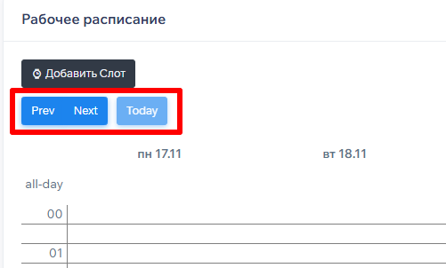 Вверху слева расположены опции перехода отображения к предыдущему и следующему отображаемому периоду, и кнопка возвращения к текущему периоду: