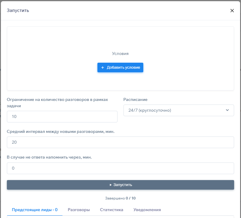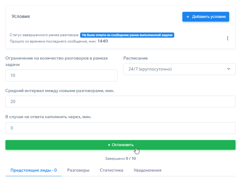 Под блоком с условием можно изменить основные параметры задачи: ограничение на количество разговоров, расписание, средний интервал между новыми разговорами, напоминание в случае неответа.