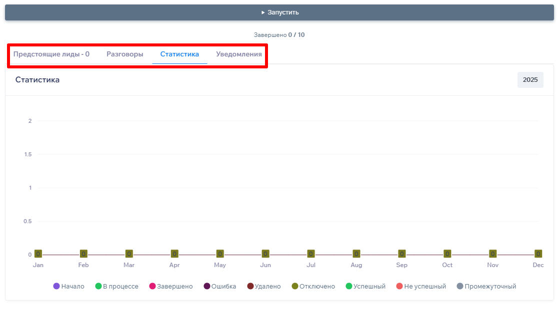 Статистика - линейный график, показывающий количество разговоров, инициированных задачей, с разбивкой по статусам и итогам по каждому месяцу текущего года.