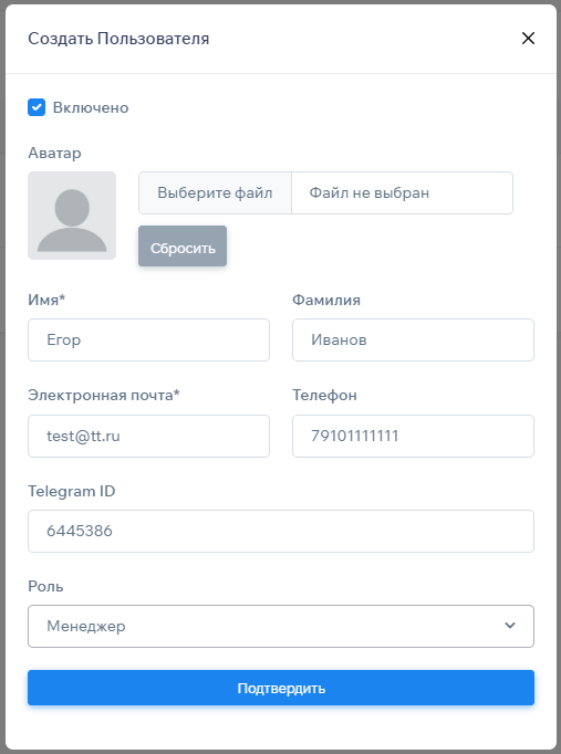 - Включено - опция активации учётной записи. С отсутствующей галочкой пользователь не сможет войти в систему.