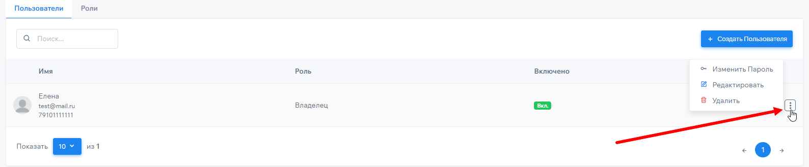 Для редактирования существующего пользователя воспользуйтесь меню действий справа от него.