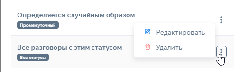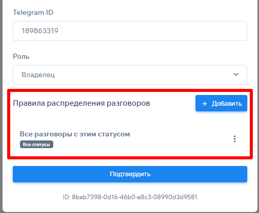 По умолчанию у владельца аккаунта существует правило распределения на него всех разговоров со всеми итогами. После добавления хотя бы одного правила это предустановленное правило можно будет удалить, чтобы разговоры с разными статусами итога распределялись на разных сотрудников.