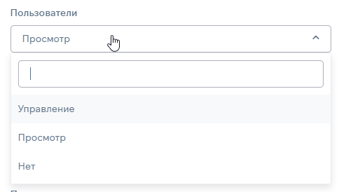 Ниже расположены разделы системы, к которым пользователь роли будет иметь доступ. Настройки доступа к каждому параметру представлены в трёх вариантах: