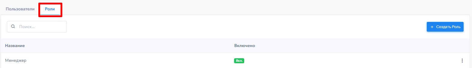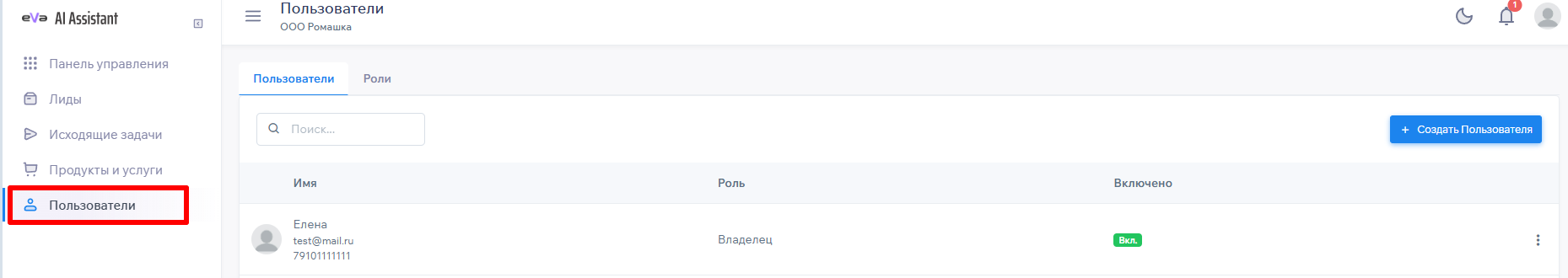У каждого пользователя eVa есть роль, настройки которой определяют возможности его действий. Роли добавляются и настраиваются в разделе Пользователя на вкладке "Роли".