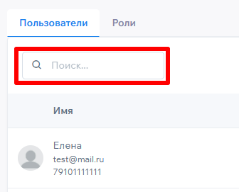Над таблицей расположено поле поиска, оно работает по имени и контактам пользователя: