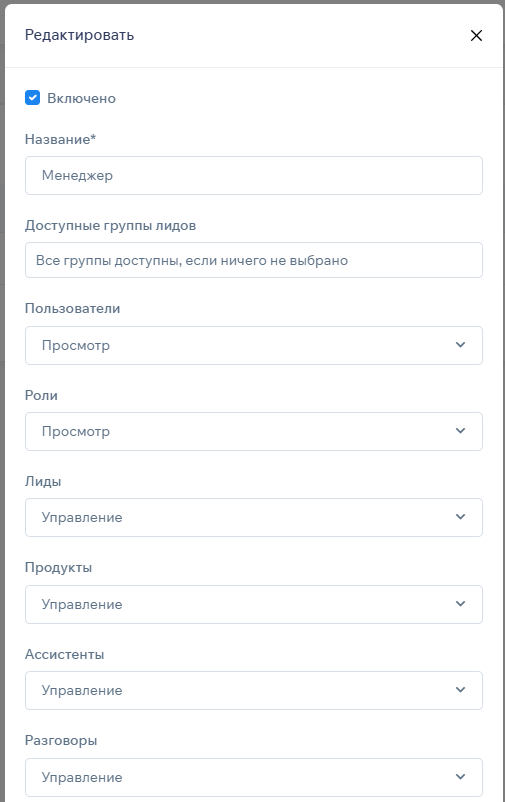 - Доступные группы лидов - перечень групп, к лидам которой пользователь будет иметь доступ. Распределение лидов по ролям производится в разделе Лиды.